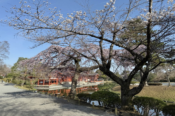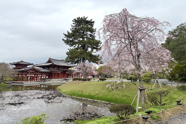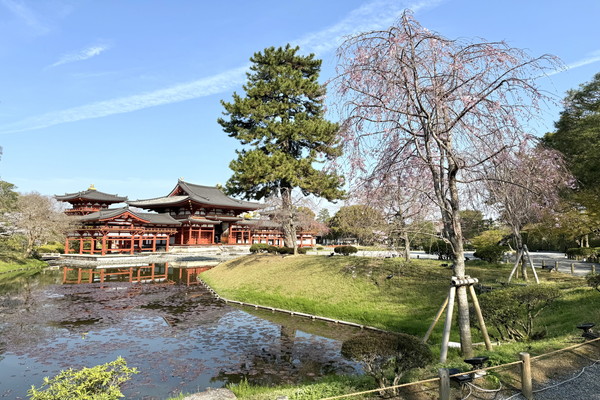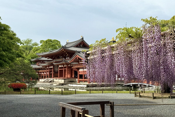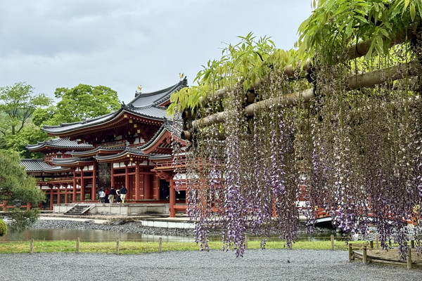 At the spot where the Phoenix Hall is visible through the wisteria, most of the flower clusters have already wilted, with only a few remaining at the base.