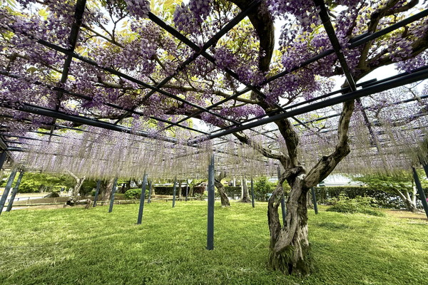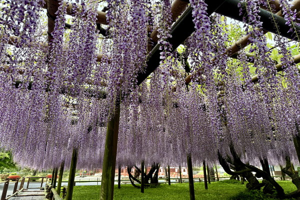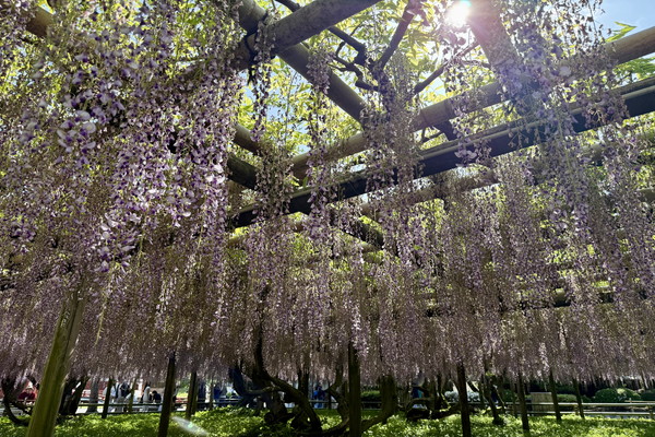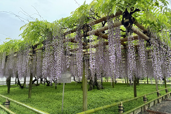 The Noda wisteria at the garden is beginning to bloom, though the flower clusters are currently on the shorter side, reaching about 30 to 40 cm in length.