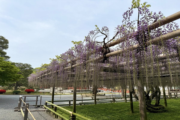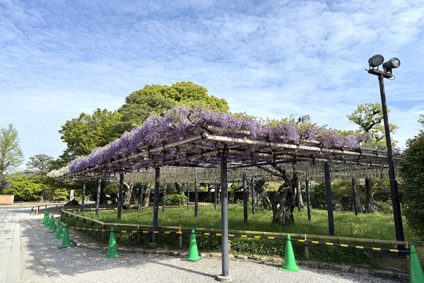 Please note that pruning of the flower clusters on the Noda wisteria and Daruma wisteria at the Main Gate, and the Noda wisteria at the South Gate, will take place from today, Thursday 30 April, through to tomorrow, Friday 1 May.