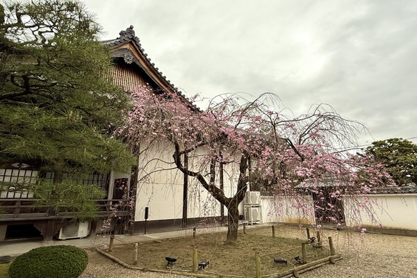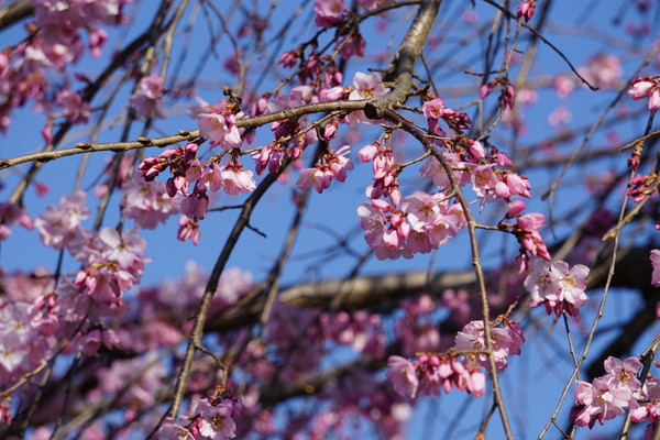 庭園の南にある早咲きのシダレザクラは八分咲きとなっています。