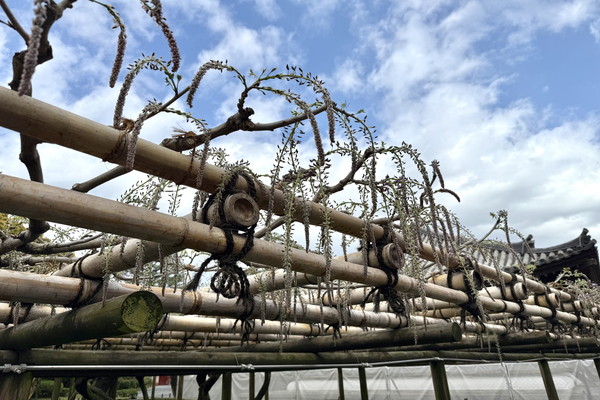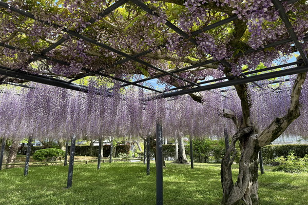 The Noda wisteria typically reaches its peak in late April; however, this year, the flower buds are developing five to six days ahead of the usual schedule. Depending on upcoming weather conditions, there is a possibility that they will reach their peak bloom as early as around April 18 of next week.